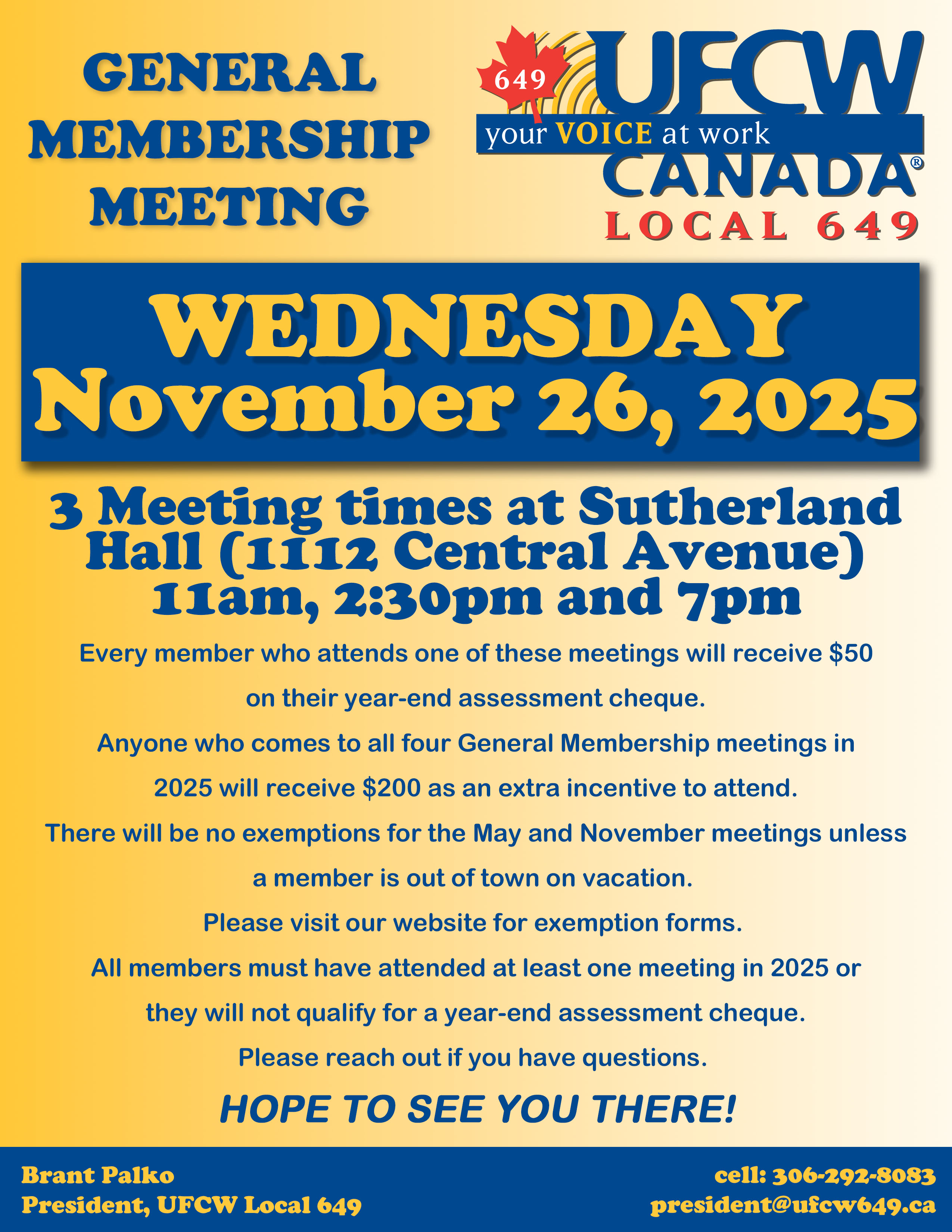 UFCW Canada Local 649 is the union for workers at Federated Co-operatives Limited (FCL). Our local represents members at the FCL food warehouse, feed mill, Saskatoon and Melfort propane plants, and home office buildings. United and strong, UFCW 649 is committed to achieving dignity, equality, and safety in the workplace for all members.